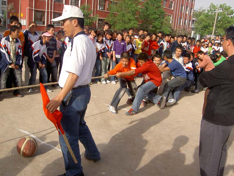 随着裁判长一声号响,啦啦队的同学们扯着嗓子喊着"加油"。双方队员们也使出了九牛二虎之力。双方旗鼓相当,谁也不让着谁。看着他们后倾的身体,紧绷的面庞,一串串汗珠顺着脸颊流下,让人感到一股不可抗拒的集体主义精神。