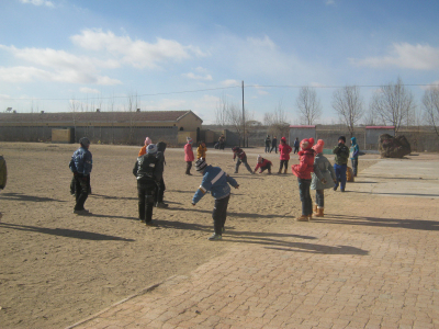 瞧,那是一群学在干什么呢?噢,原来他们在老师的组织下,在玩丢手绢游戏。你看,被抓住的同学在圈内给出节目呢!还有的同学在往其他同学身后丢手绢,被告发现了,他们你追我赶,好不热闹!