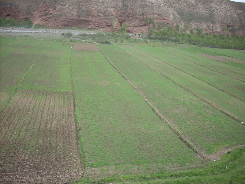 放眼向大路两旁望去。大路两旁已经种满了小麦,它们经过春雨的滋润,已经茁壮地长出了地面。从远处看,它们一块,一块地分布在大地上,好像用网子把它们隔开了,看起来十分整齐。