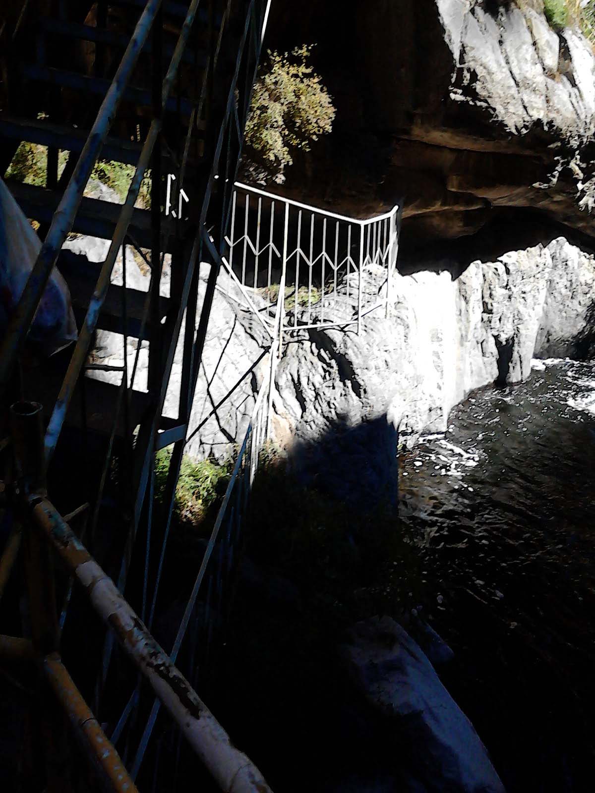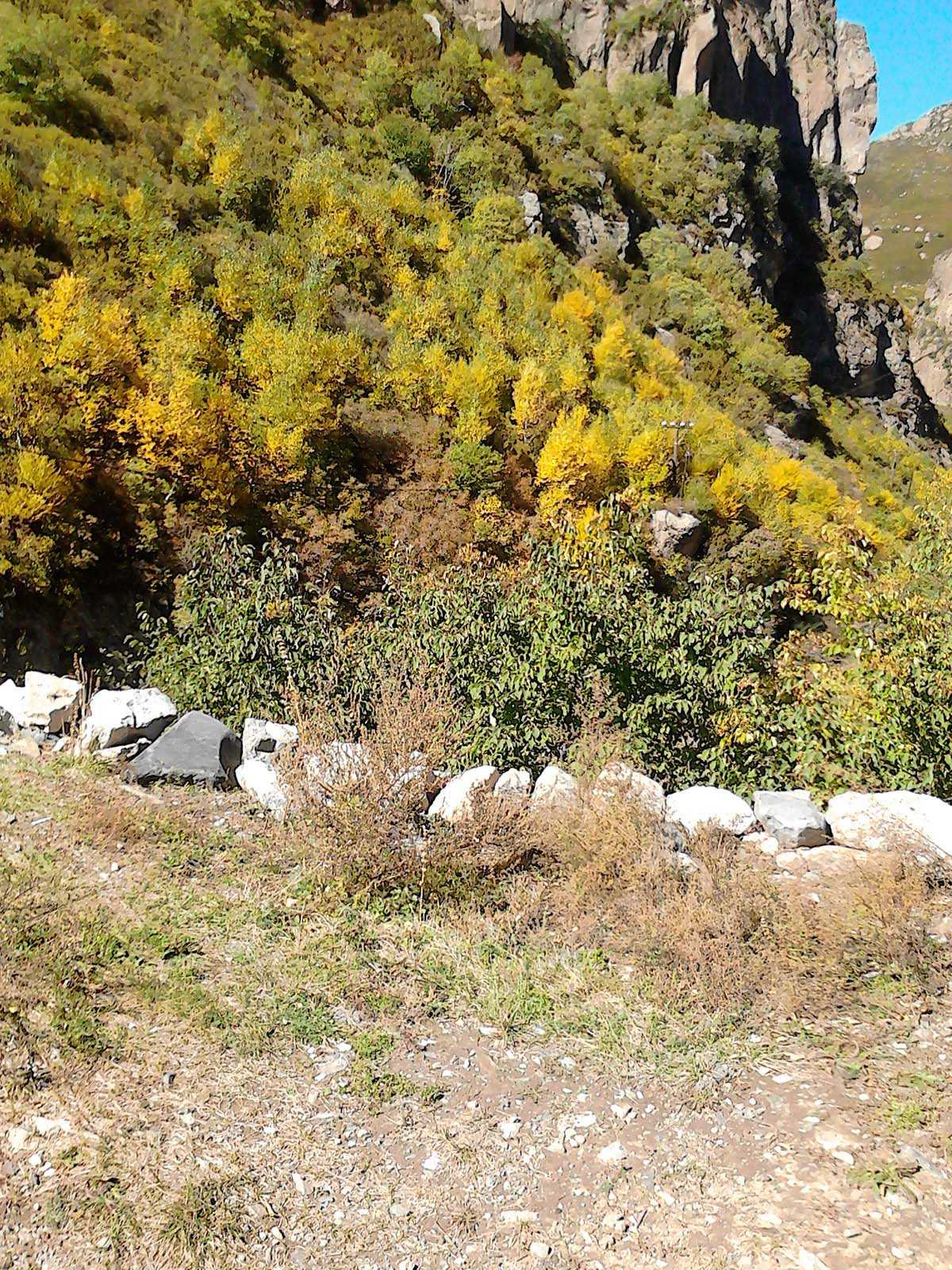 我们沿着这股泉水溯流而上,峡谷里寒气逼人,把手伸入泉水中感觉冰冷刺骨,山坡上的植被有的已经变成红色,有的已经变成黄色,还有的依旧是绿色,远远望去,就像给大山批上了一件五彩斑斓的外衣。