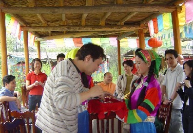 热情好客是土族历来的风尚,迎送客人三杯酒就是这种风尚最突出的表现。主人在客人到来之前就拿着酒壶、酒杯在大门口等待,待客人下马或下车,先敬"下马三杯酒";客人进门时又敬"进门三杯酒";待客人脱鞋上炕、盘腿坐下时再敬"吉祥如意三杯酒";当客人离去时还要喝"出门三杯酒"和"上马三杯酒"。 欢迎来我的家乡来体验家乡的风情和文化。