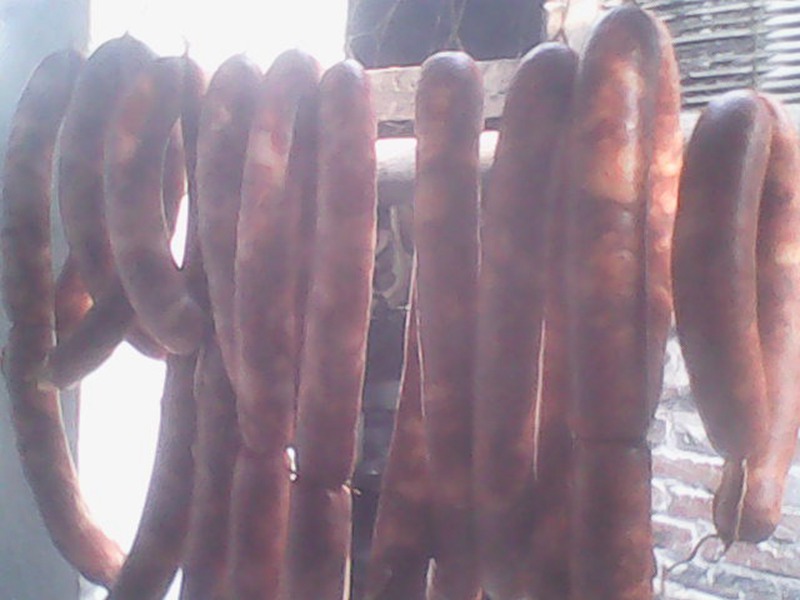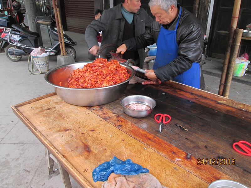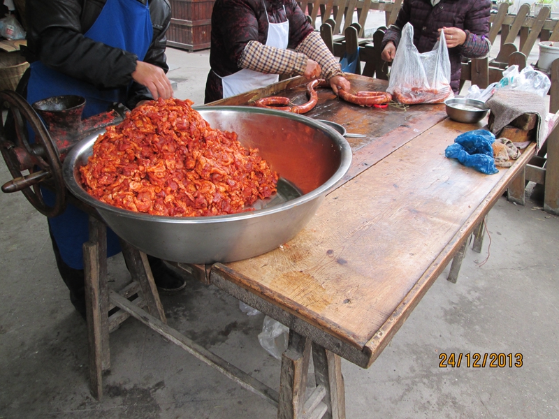 剁完肉以后,妈妈又端了一碗还没洗的猪肠子,我们又一起到了河边去把它洗干净,然后就准备背着肉上街去装了,到了街上,只见人山人海,我们费了九牛二虎之功,才挤到了加工香肠的地方。
