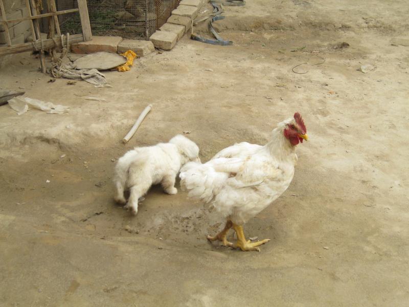 它也有郁闷的时候。也许它是饿了,也许是心情不好,反正今天有点不乐意。小母鸡想和它玩耍,狗狗也不理睬它,自己不声不响地走了。