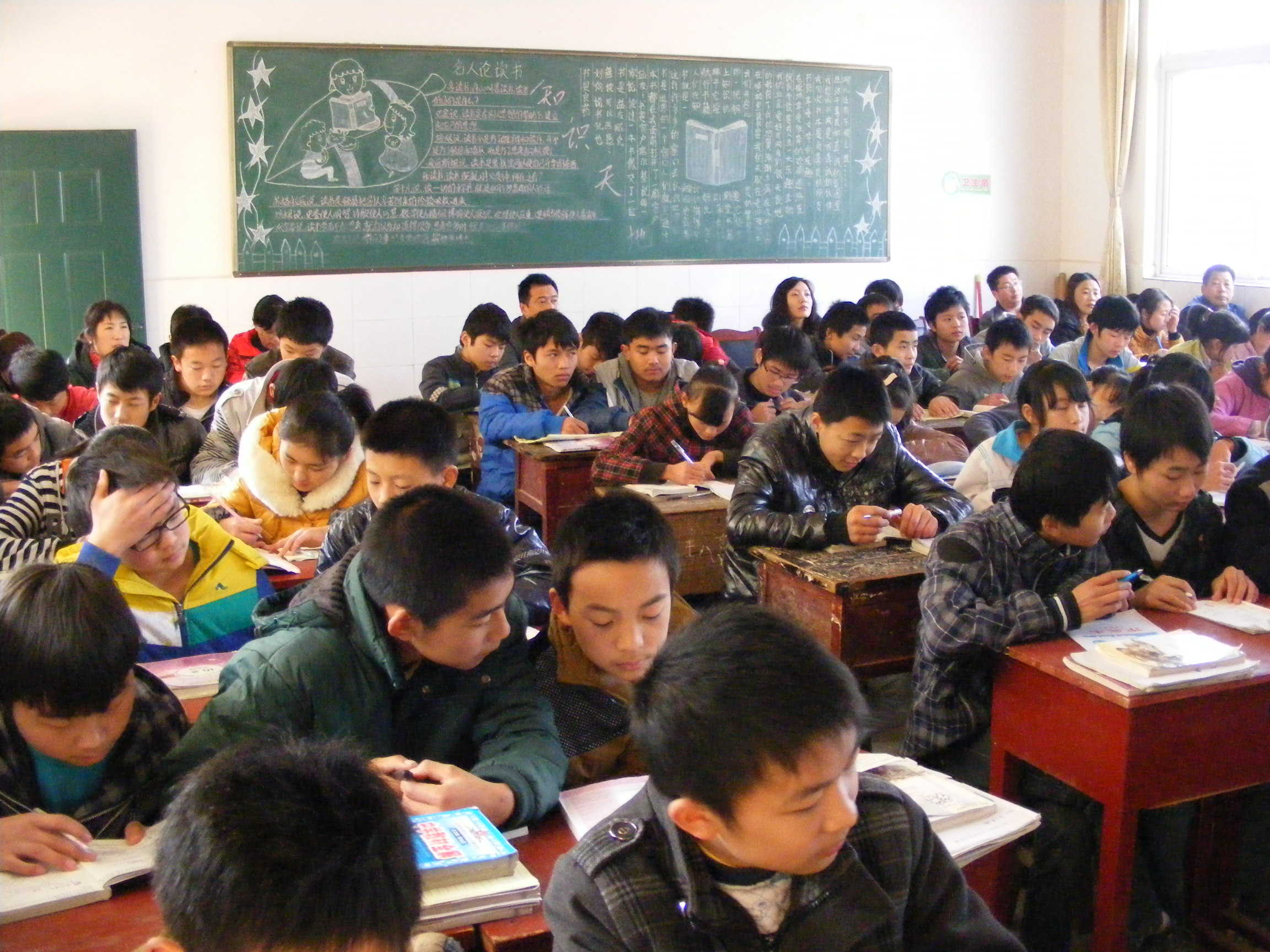 当然我们九年级学习也很努力,每一个学生都很专注。教室里终日端坐着一些学生,嘴里咬着笔头,拿着笔轻轻敲脑袋。仿佛若有所思。还有一些同学正奋笔疾书,抓时间,赶学习的进度。争分夺秒的气氛充斥这教室。