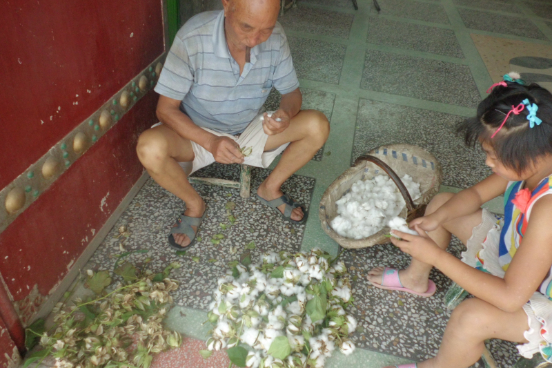 待棉花成熟后,我们将里面白白的东西剥出来晒干之后,就变成我们大家熟知的棉花了,妹妹和爷爷正好在剥棉花,他们小心翼翼地剥着棉花,生怕浪费了它们。