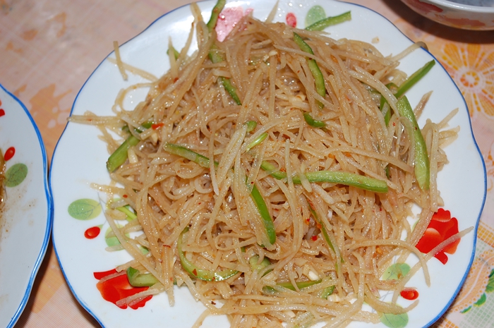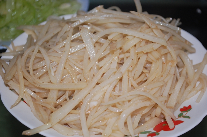 把土豆切成条状后,在锅里倒上油,到油热的时候,放进葱花与辣椒,让辣椒的味道充分散发。过一会放入土豆炒一会后,可能会焦,要经常搅动,倒入点水,等到闷一会后,尝一尝,如果盐少了,放入点盐,再倒点水。就这样,在尝一尝,就熟了。一盘佳肴;土豆就问世了。可好吃了!
