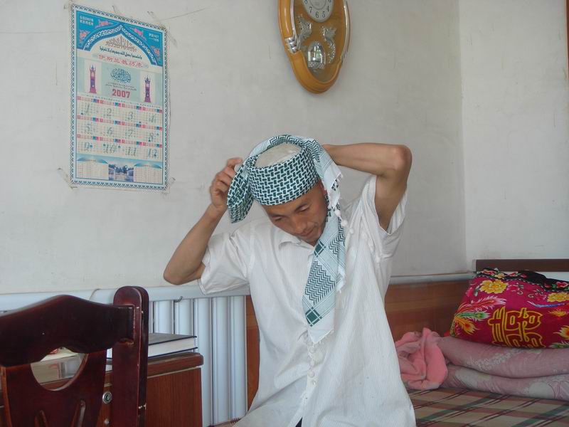 缠的时候先把带子放在头上,一头短,一头长,再把较长的一段从下巴在绕道耳后与短的一节打一个结,缠好以后是一个圆形,就像一顶帽子。