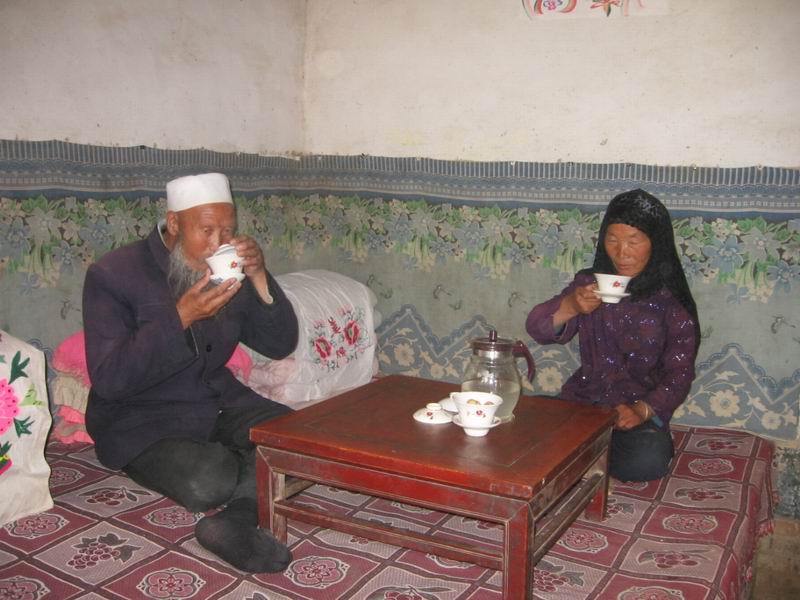 茶泡好以后,专供年过六旬的长胡子来"品茶"。品茶这一环节是八宝"盖碗茶"中最有趣的。两位老人盘盘腿坐在炕上,边剐碗盖,便喝茶,看起来是多么地井然有序。他们不慌不忙,慢慢地品味,完全沉浸在了茶的香味之中。盖碗茶也是穆斯林招待客人的主要方式,家中来了尊贵的客人,当地穆斯林会奉上香气扑鼻的盖碗茶。
