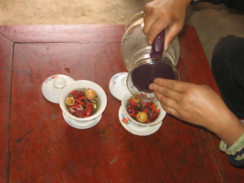 八宝"盖碗茶"是由核桃仁、大红枣、白糖、茶叶、葡萄干、桂圆、黑糖,还有宁夏五宝其一的"枸杞" 这八种珍贵的材料配制而成,具有独特的香味。
