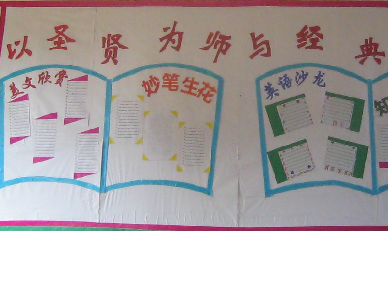 经过一周多的设计、规划,然后加班加点的布置,我们的"小天地"终于焕然一新啦! 你可不要小瞧我们的设计哦,这次我们可是统一思想,整体规划。最大的工程就是我们后墙这一块"以圣贤为师,与经典为友"几乎动用了我们班全部能写能画的"高手"们,而且每个人必须保证按时完工,负责就可能影响全班竣工的时间,所以我们每个人都很努力,自己没有任务的也陪着,或随时准备着搭把手,真是人多力量大啊!