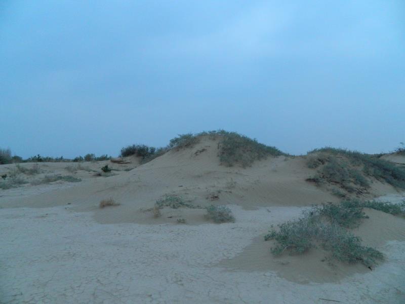 接下来,我们向沙漠的深处"进军"。我们可以看到一个大大小小的沙丘,就像沙漠中的一座座小山,小山连绵不断,数不胜数。大大小小的沙丘之间有弯弯曲曲的平地,这就是沙尘暴过后留下的"纪念"。 当沙尘暴来临时,漫天的黄沙随着大风飞扬移动,黄沙被吹净的地方就出现了平地,在有沙生植物的地方,有这些沙漠中的"卫兵"守卫着,大风不能把"卫兵"和他周围的黄沙带走,就形成了一个个小沙丘,也留下了沙漠中这壮丽的景观!