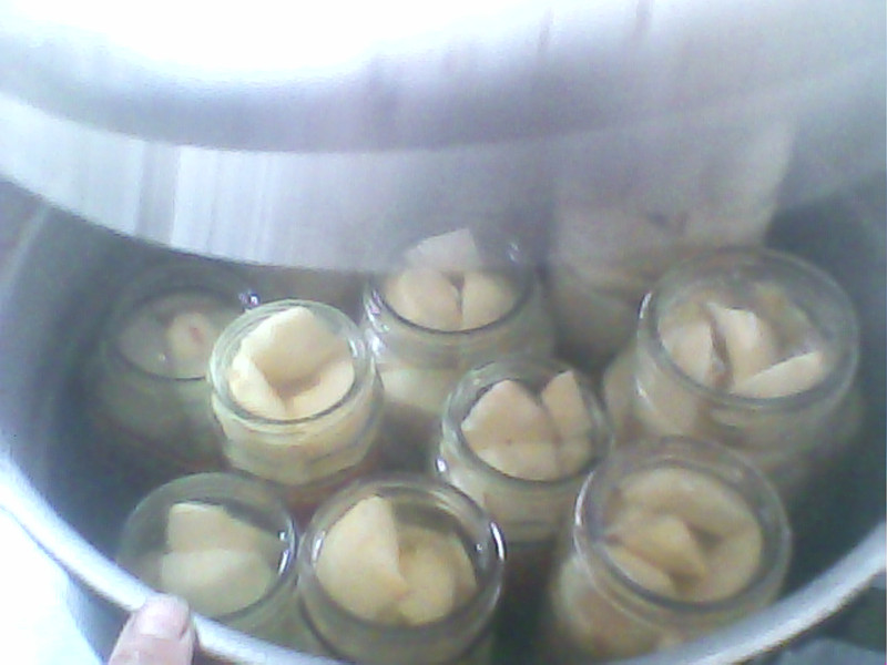 第一步,把切成的果子统统装进已经消过毒的瓶子中;第二步,用开水糖好的糖水浇在果子上,并把瓶盖盖上,但不能拧紧。第三步,把它们煮沸十分钟。第四步,把瓶盖拧紧。