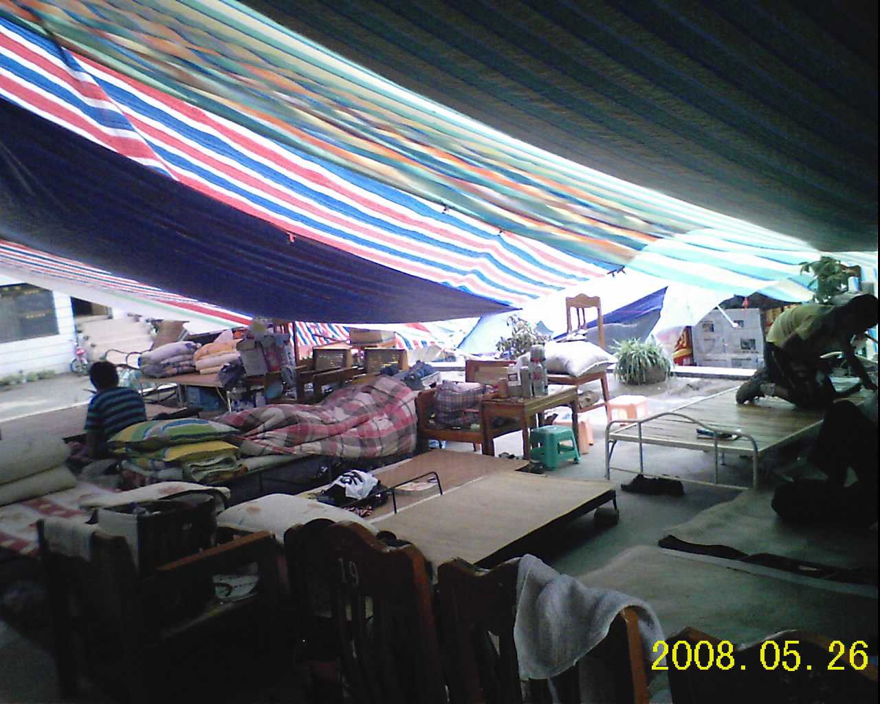 国旗还在高高飘扬,但是旗台变成了避难所。整个旗台上挤挤满满搭满了铺,用篷布将光线遮的很昏暗。