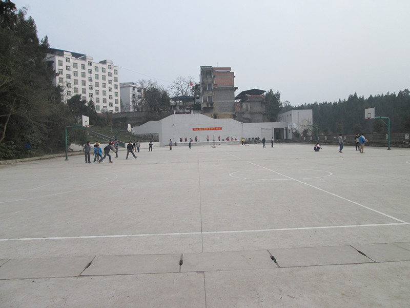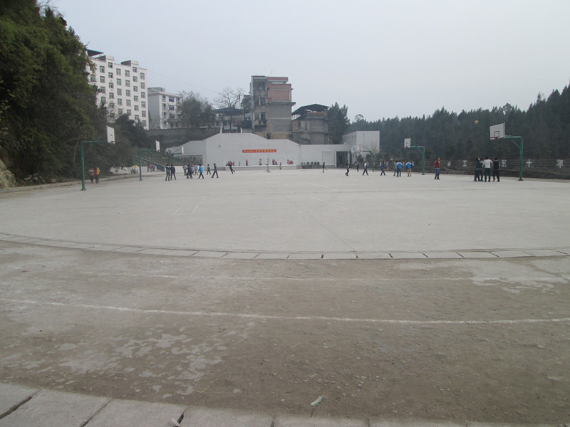椭圆形跑道的中间是三个篮球场。我校没有专门的足球场,所以学校就大量地培育篮球课外活动。每一个篮框都有自己的领域,每一块领域都有两架篮球框,我校一共有六架篮框。那六架篮框每天都有人去拜访。
