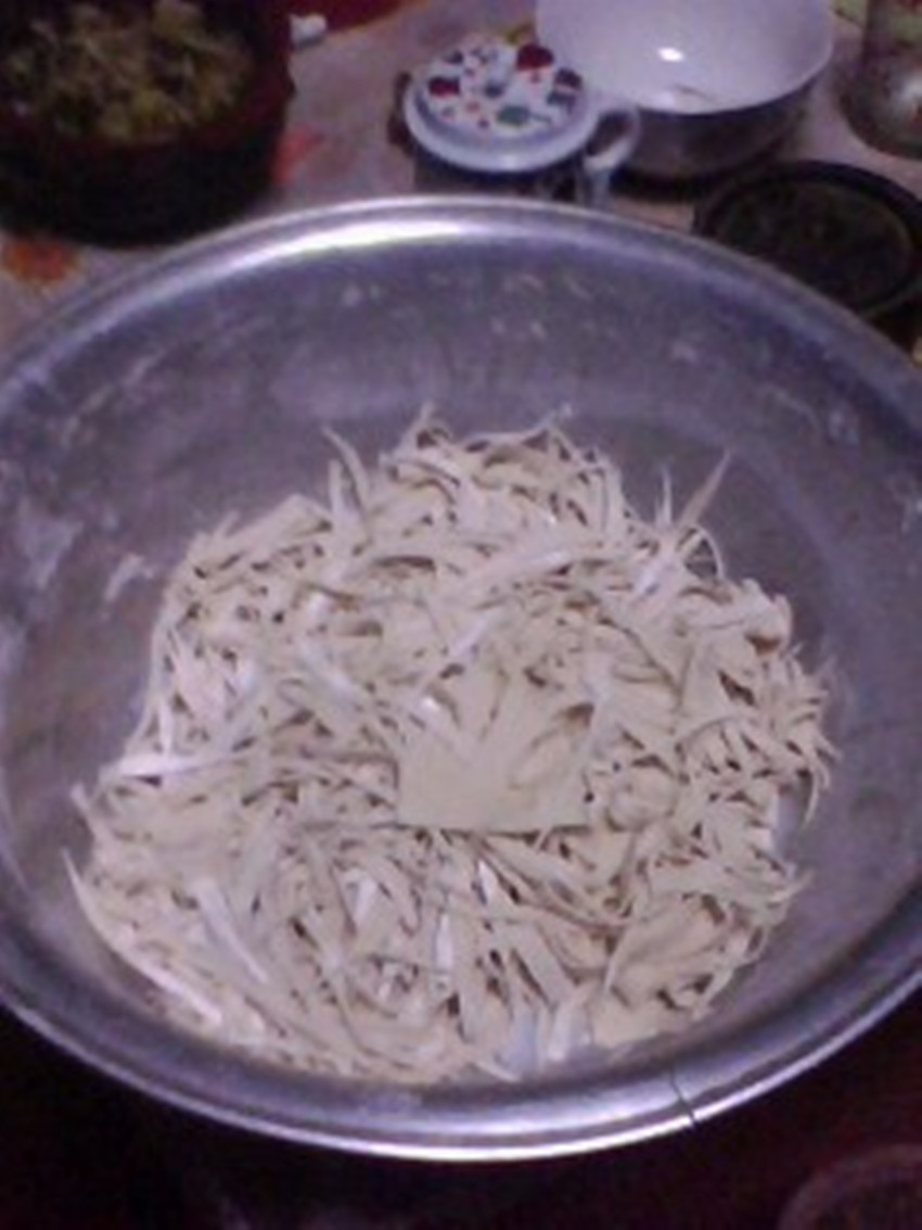 接下来就到切了,切的时候千万要注意用力均匀,否则,面于面之间就会黏在一起,分不开了。最后就到下饭了,这时你可以根据自己的口味放调料,最后,再加上自家腌制的咸菜,那可真是美味十足啊!