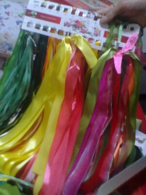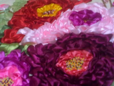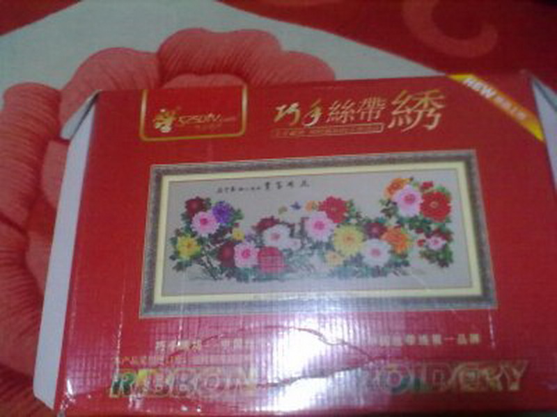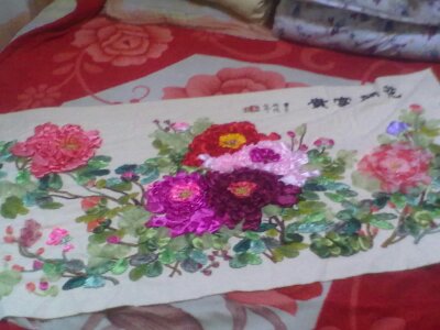 为了绣这幅丝带绣,外婆买了好多好多的丝带线,红的,黄的,粉的,绿的,蓝的,青的......。这幅丝带绣.绣完后,丝带都被用完了。可见外婆为了这幅丝带绣.花了多大的功夫。