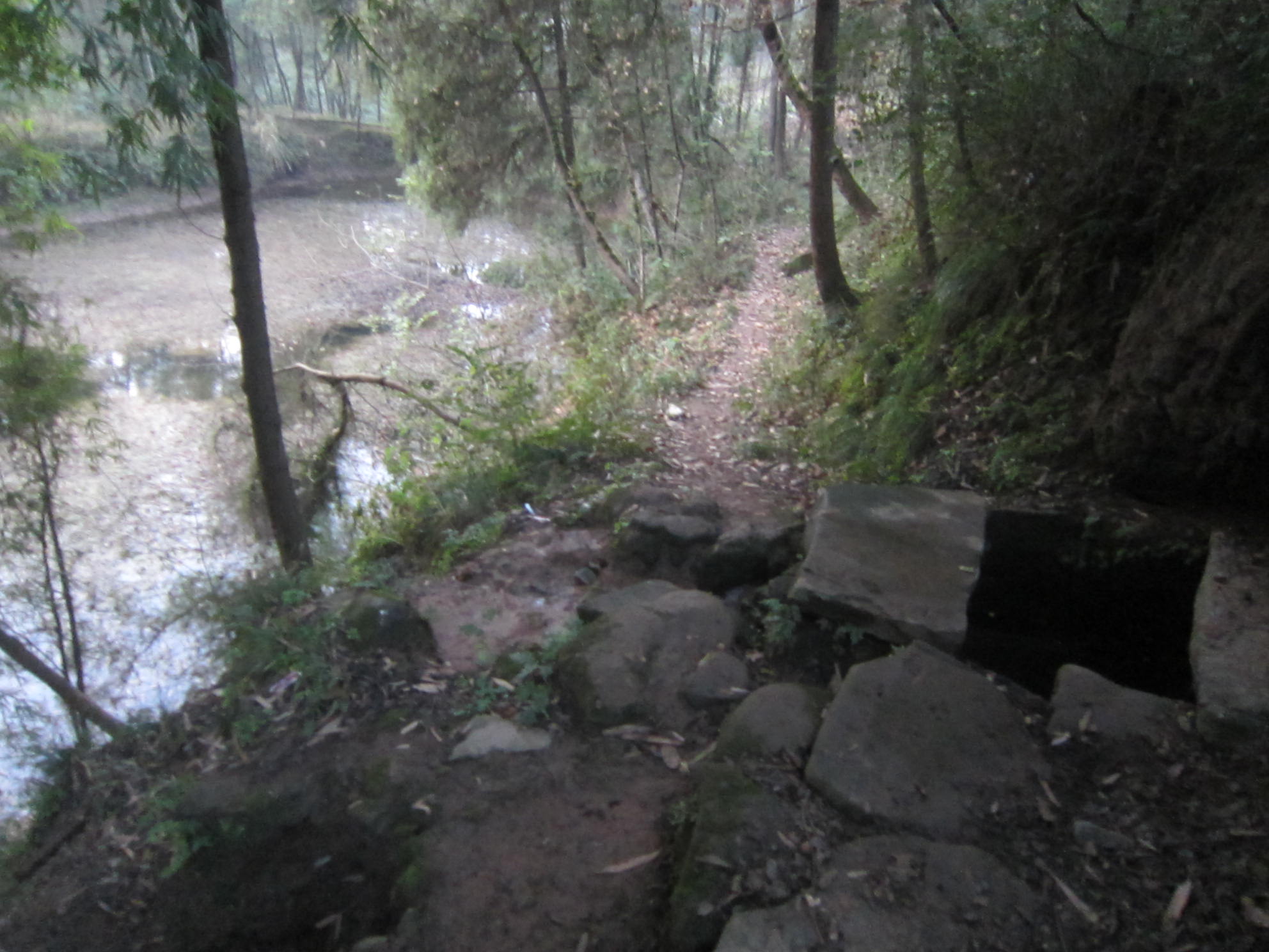 小路旁有一个小泉,它实在是太小了,实际还不能称它为泉。它静静地流着,就像一位默默无闻却给予你动力的朋友。泉水在旁边汇成了一个不足一平米的小池。小池的水就像一块透明的水晶,泛不起一丝波澜。池底的绿色石板纹路如一条条蜿蜒的小龙,使平静的小池如翻涌的大海一般具有生机。而另一侧水塘中,水与泥交杂,似乎水已死了许久。"问渠哪得清如许?为有源头活水来。"
