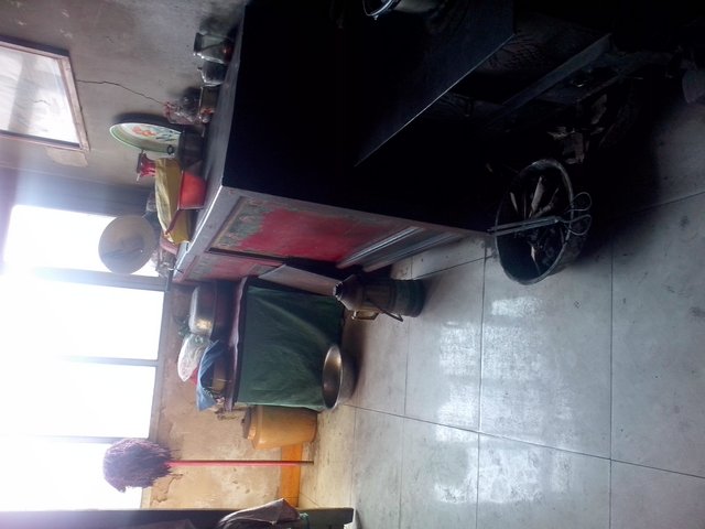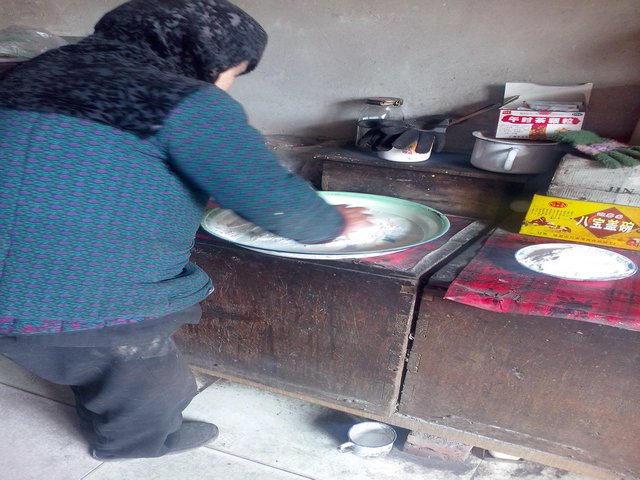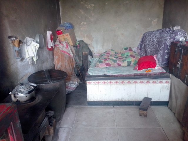 同一个大门,走进去后有两条路,一条比较宽是儿媳他们进出的,另一条路窄窄的使用石块铺的,老人只在这条窄道上进入活动,儿媳也给老人另外分了一间屋子,开了一个门,虽然没有用墙堵起来,但这样的行为和用墙隔开是一样的。 老人的屋子里摆着几个很旧的箱子,我看见老人从那里舀了一碗面粉,倒在漆盆里,添一点水就开始和面。老人说:这点面足够我和儿子吃两顿了。屋子里还有一个火炉,我们去的时候炉子里没有火,放着一个水壶也是凉了的。屋子早把房子熏得乌黑。只有一个炕,摸上去不是很烫,还会有老鼠出没。 两家从不会越界的。生活上老人也和儿媳完全的独立,老人有低保和养老金足够日常开销了。