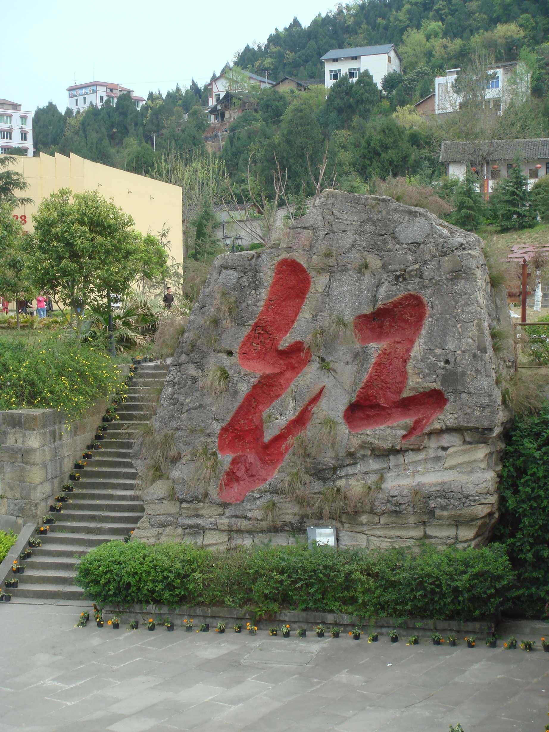 我们在山上转了转便下了山。我站在那个大大的坦克前,看看四周,在四周没得石壁上有许多的壁画和一些字,甚至有些我都不认识,在向上走的石梯旁还有一个大大:"红"字。苍溪是一个红色革命老区,这个大大的红字不知浸了多少先辈的鲜血。在这里来还是有一定的收获的,还是很高兴的。