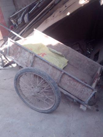 架子车的结构非常简单,它的构造和跷跷板非常相似,不过跷跷板的支点被换成了两个轮胎,轮胎被一根钢梁连接。钢梁上是一个加了护栏的木板,木板下还有两根一模一样、非常粗壮且比木板长许多的木棍,这两个木棍在前面突出了大约一米的距离,在后面也突出了大约一分米的距离。家乡的人都把这两根木棍叫做沿条,它是为了拉架子车容易一点而做的。拉架子车需要两个条件,一是沿条,二是拉绳。拉绳是一根绑在钢梁上用来辅助沿条拉动架子车的绳子。拉架子车的时候需要将拉绳套在肩膀上,并且要用手紧紧地握住沿条,手脚一起用力才能拉动架子车。架子车也有‘‘饿’’的时候。这时候你就会奇怪了:架子车是机械,怎么会饿呢?原来架子车用久了轮胎就会蔫了,在这样的情况下,架子车就不能用了。因此架子车就要‘‘吃饭’’,所谓的吃饭,就是充气。给架子车充好气,就可以更好的使用了。