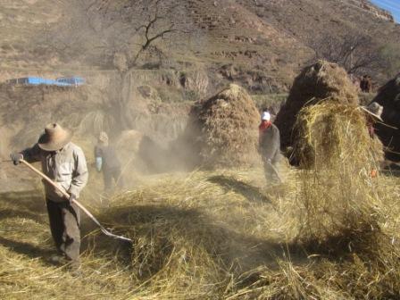 接下来便是好似扭秧歌的挑场了,人们拿着工具,围着麦子走动,以便于让麦子更加充分的脱粒。最后一道程序便是扬场,待安置好风扇的位置便打开它,借助它的力量来个“草船借箭”,将一颗颗精神饱满的麦粒与小一点的草和尘土分离,扬场时看着漫天飞舞的灰尘也是一种美的享受,又似一种令人害怕的感觉,好似一场沙尘暴已悄无声息的来到我们的身边。
