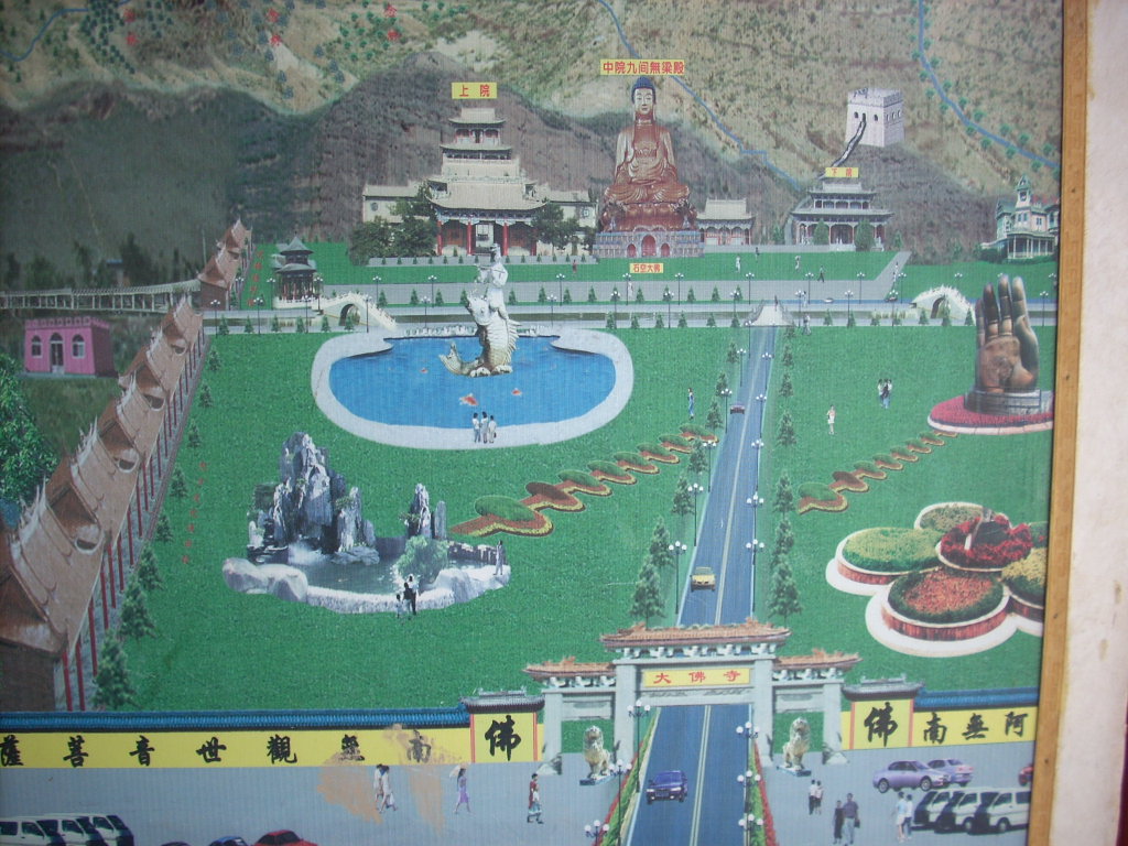 从空中鸟瞰大佛寺全景,它的美丽令人心旷神怡。依山而建的寺庙,绿草翠柳环绕着湖水,高大的石像鹤然立于之中,似乎是 一切尽在掌握之内。自然、和谐,富有情趣。