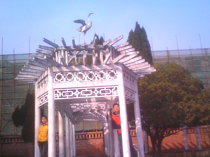 前面还有一个亭台,台顶有一只飞翔的朱鹮。我的好朋友 站在上面的样子,这很是让我好奇,因为我也想站在上面 。