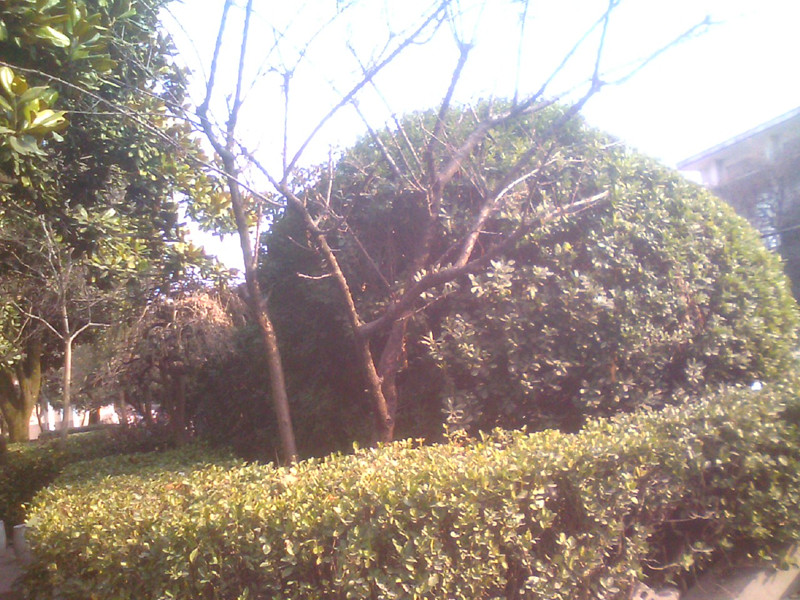 首先映入眼帘的是一个花坛,因为是冬天,所以花坛里没有什么花,树上也没有任何色彩,只有一个修剪整的绿化带。