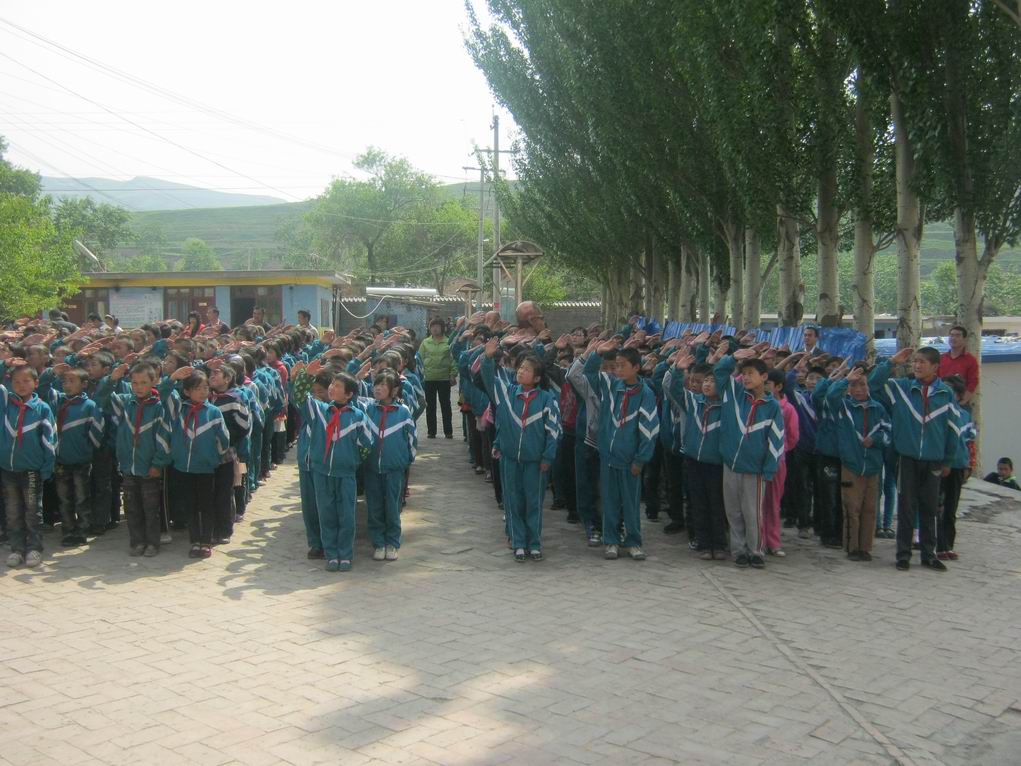 早晨,从山上,从山沟里里,从公交车上,走来了许多小学生。有男生、有女生,有小学的,还有初中的……到了学校从远处看学生的校服像一片草地。