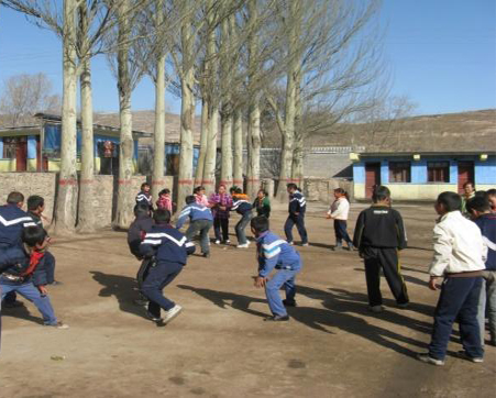 下课了,同学们在操场上跳健美操,甩大绳,跳毽子,在大树下乘凉,有一些同学在地上捡树叶、拔草、编竹篮、刨土、种花。