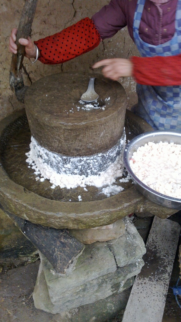 然后将洗好的魔芋切成一厘米见方的小块,再根据魔芋的多少混些事先浸泡好的大米,魔芋和大米的比例通常为2:1。米太少,做出来的灰菜会太软,难以成形;米太多,做出来的灰菜口感太硬,缺少韧性。以上步骤准备就绪,就等着磨了。磨灰菜,那可是极其需要耐心的细致活儿。通常是用一把小勺将魔芋和米的混合物一勺一勺的慢慢的倒进石磨中。几个大人轮流推着石磨转啊转,不知要磨多少圈才能完成第三道工序。磨完后的魔芋,就变成了不透明的果冻状了。