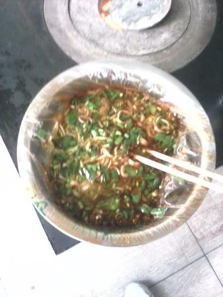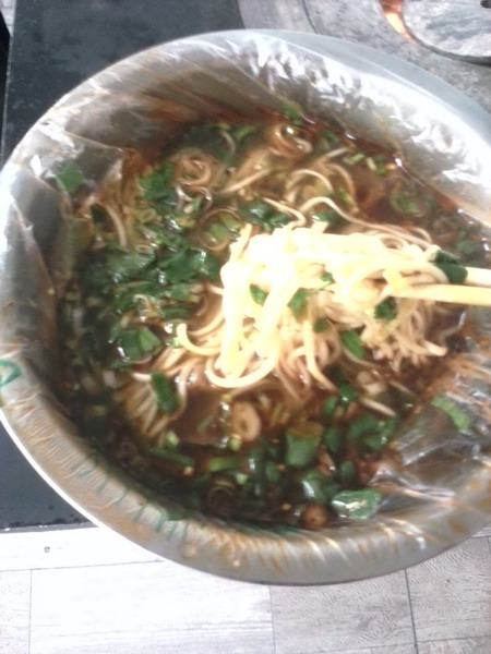 面是牛肉面的根本,一双有力的大手在与面粉与水之间调和,不一会儿,面粉成了面团。抓一些面粉,面粉如雪般飘落在面板上 ,突然,那双大手握住面团使劲拉,一下又一下,灵活的穿梭在在大手指间,面团疯狂的跳着舞。一瞬间,所有的动作都停止,一根根细如发丝的面条从手中滑落,飘落在了锅里。 牛肉面端上来了,青青的汤,白白的面,上面点缀着红红的油、绿绿的香菜和蒜苗,使人垂涎三尺,立刻端起来吃个精光。