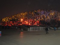 晚上我们到鸟巢去玩了。国家体育场(“鸟巢”)是2008年北京奥运会主体育场。由2001年普利茨克奖获得者赫尔佐格、德梅隆与中国建筑师李兴刚等合作完成的巨型体育场设计,形态如同孕育生命的“巢”,它更像一个摇篮,寄托着人类对未来的希望。设计者们对这个国家体育场没有做任何多余的处理,只是坦率地把结构暴露在外,因而自然形成了建筑的外观。