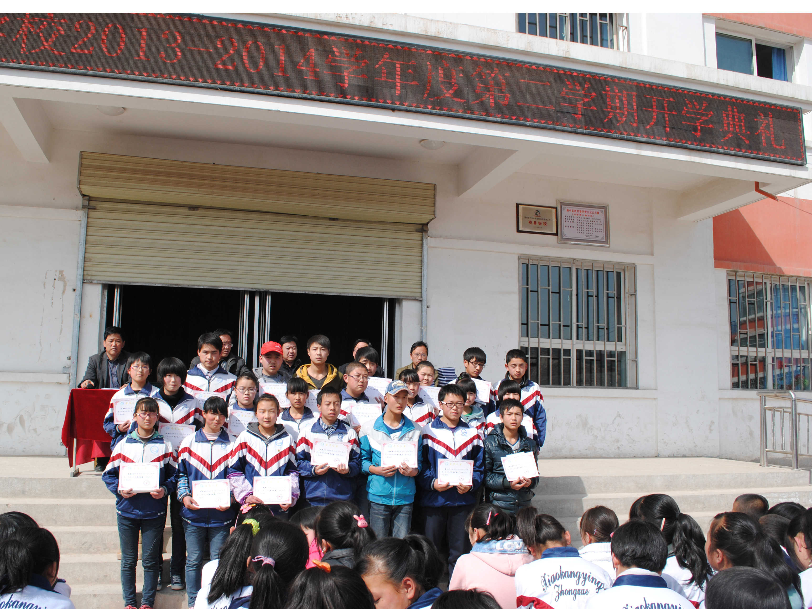 开学典礼在一个特殊的日子里召开了 ,首先第一个过程当然是升国旗,奏国歌,然后为上学期获得荣誉的同学颁奖,看着一张张奖状,映射出同学们努力的成果,映射出同学们的骄傲。在开学典礼上,我也获奖了,长在领奖台上的我,在心中也默默地祈愿:"希望能在即将到来的2014年的中考中,取得优异的成绩,靠进重点高中的大门。"
