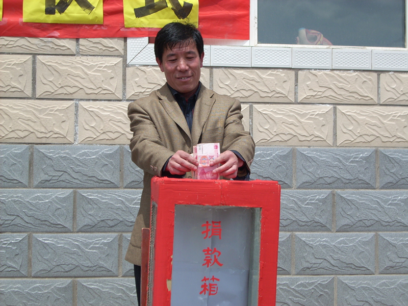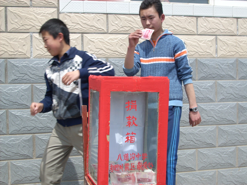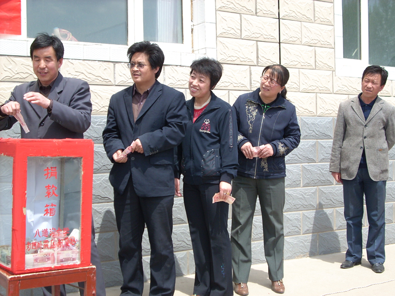 在地震发生后,有很多人们都为灾区捐款捐物还有人献出了自己珍贵的血液.为人们送去了一片片温暖.我们学校当然也不忍心看着 四川人民受苦受难.这不,今天我校开展了"八道沟中学为地震灾区捐款仪式"在学校里上至学校领导,下至每个学生,既使是做饭的师傅们都向灾区献出了自己的一点爱心.