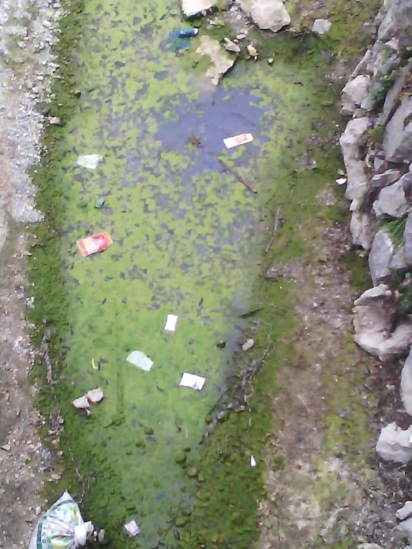 我记得曾经水中还有许多石步子,就是由大而平的石头打的"桥"它们渡过一个又一个行人。着实发挥了极大的作用。而现在呢。它们依旧像山一样矗立在那儿,可是它们身体上面却附着了一层褐黄的抹布,一窟窿水上都是青苔和垃圾......