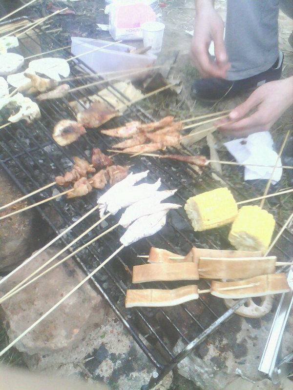 早早的就去菜市场,经过一番唇枪舌战讨价还价之后,买到了肉和需要的作料之后我们就开始忙活了。我们分工合作,我和小利把瘦肉切成很薄很薄的片儿,然后把事先准备好的油、磨成粉的花椒、自家做的辣椒面一起放在切好的肉里腌几分钟,然后用烧烤签串起来。在等待的这段时间里,我们在火腿肠身上划上密密麻麻的口子,这样会更好吃,照着上面的作法在烤的时候放上作料。看,李月和妹妹正在生火呢,一阵西风吹来,直呛得的两人咳嗽个不停。慌乱之中他们两忙用手掩面,可是他们忘了,他们的手上全是黑炭灰,这会两人已经变成了大花脸,惹得大家笑得眼泪花都出来了。两个人还莫名其妙,当他们看到彼此脸上的尊容时,两个人才,他们也忍不住笑了起来。