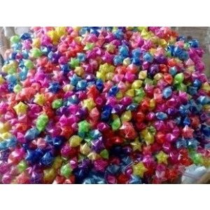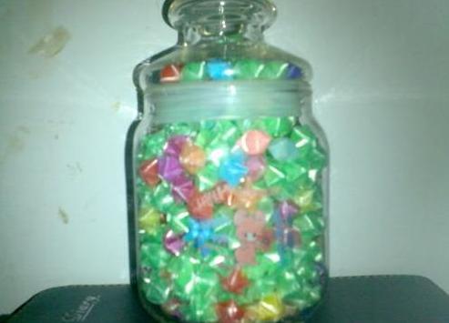 上初中以后,学到的知识越来越多,虽然明白了那些东西是没有任何使用价值的,但依然戒不掉。偶然的一天,我在一个饰品吧中看见这样一个东西:在一个闪着水晶般光芒的玻璃瓶中,装着五颜六色的小星星,闪闪钻石般发亮。标着的价格不菲。我以为那是需要多高超的技术才能做出来的,向老板一打听,才知道,那尽然是手工编的。