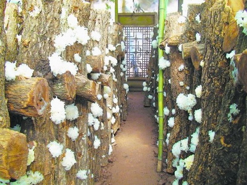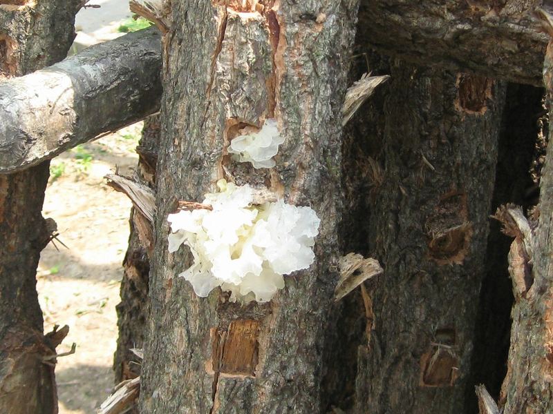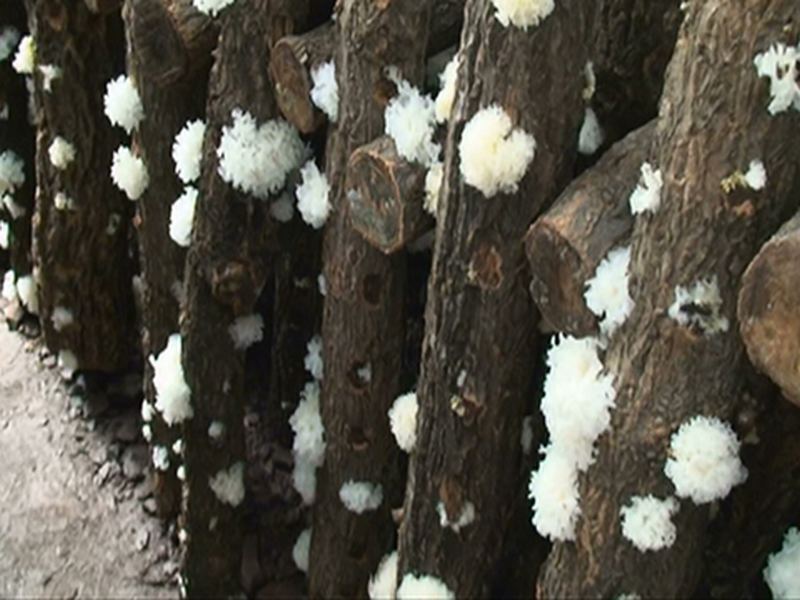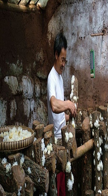 三周过后,就得栽菌种。栽菌种可是个麻烦事儿,要在晾好的耳棒上用凿斧开孔,一人开孔,七八个人将菌种塞入孔中,然后用木锤敲紧,以防脱落。