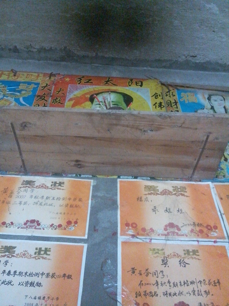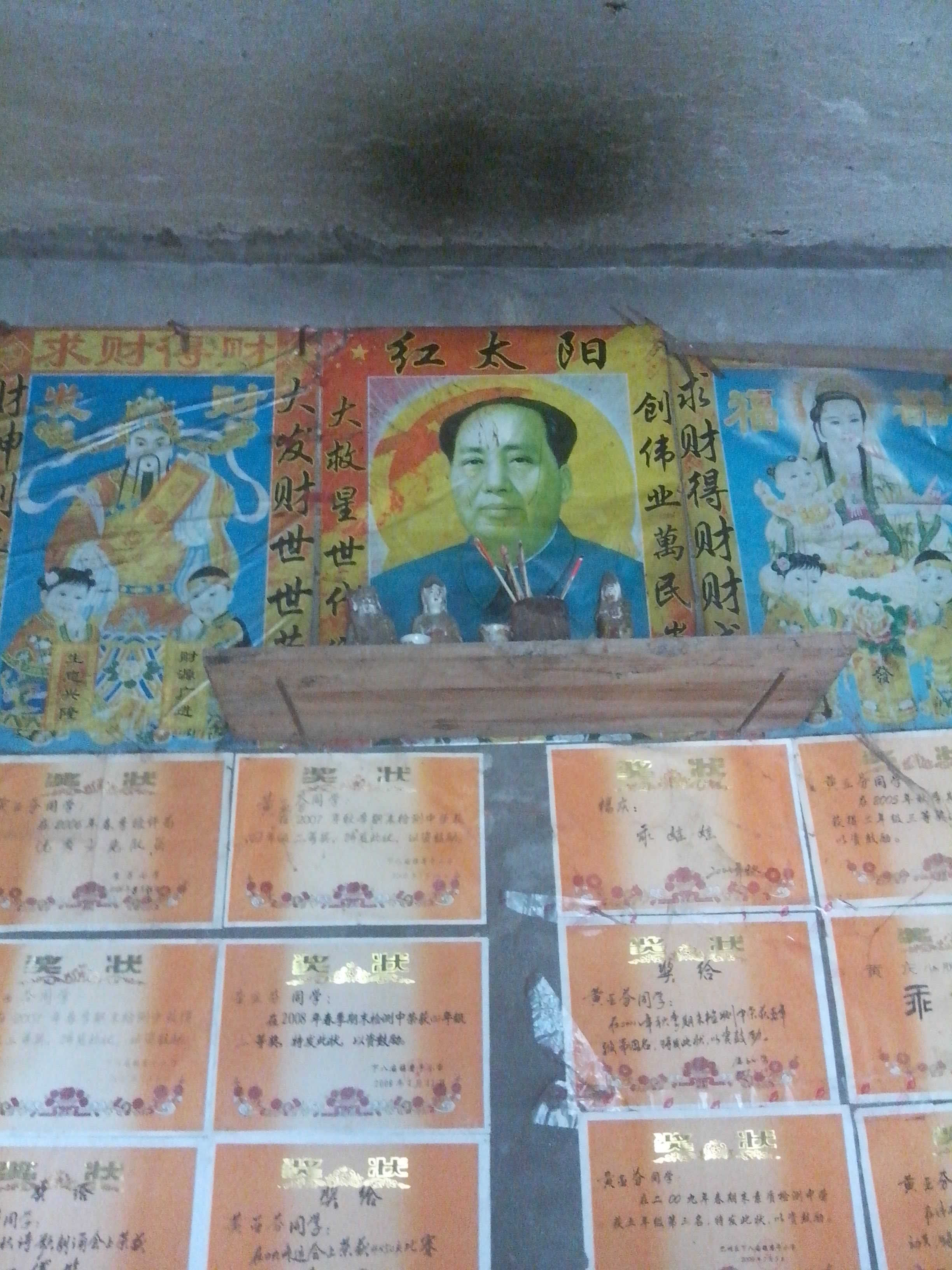 一进我家堂屋,你的眼前就会闪现出一个神龛,用我家乡的方言来说,就是"神槛子"。所谓神龛就是一块木板由两根钢筋支撑做成的。它是做在常人摸不到的高度的。因为做矮了,就会让人很轻易地碰到,碰到的话那就意味着是对神的大不敬,家人是不准有人碰它的。