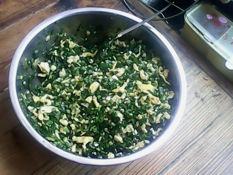 今天妈妈给我们做韭菜盒子。我和妈妈一起做。 首先,我们需要准备盒子馅。这次昨个韭菜鸡蛋馅的盒子吧。把切碎的韭菜沫和炒熟的鸡蛋混合在一起,放上适量的调味品,就好了。