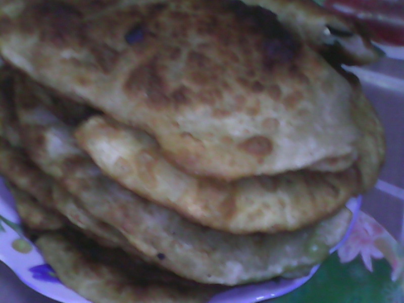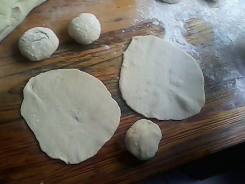 然后,我们来和面。 用热水和面再加点盐,这样既可以使擀出来的面皮不会太硬,也不会让面皮在煎炸的时候破了。 面和好以后,揪称成大小差不多的面团。这个面团要比包饺子的面团大一两倍。然后撒上面粉,把它擀开。