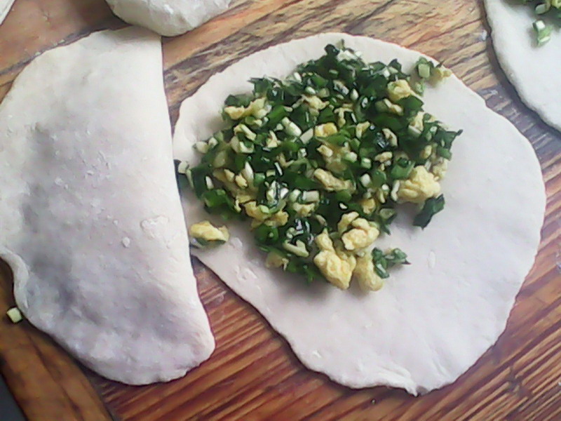 现在,我们把一切都准备好了,就可以来包韭菜盒子啦! 在面皮上放上两勺鸡蛋韭菜馅,然后铺平,千万不要放多了哦。接着我们把它对折一下,就像做荷叶饼一样,然后把边缘捏在一起,撒上面粉,等着下锅了!