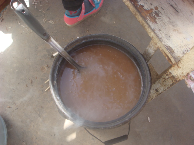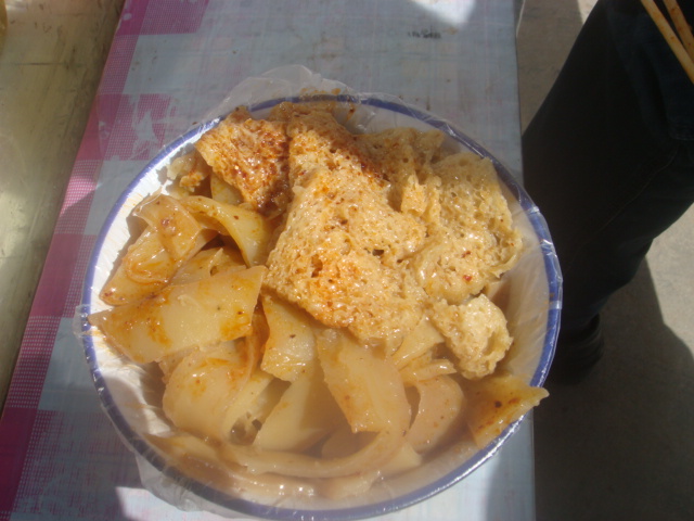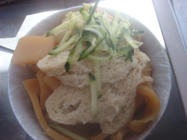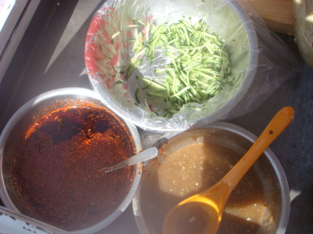 下一步就是做点小菜和腊卤。切两根胡萝卜和两根黄瓜,洗完切成丝。熬腊卤时,先用葱、姜、蒜呛锅,然后再加一勺水,待水滚开后,加适量的醋和各种调料,再滚上一会儿就可以端下来了,在准备蒜泥和辣酱。这时候面皮和面筋都蒸好了,就可以出锅了,把准备好的东西放在桌子上,把面皮和面筋放在案板上,切成条,放在碗里,然后加上醋卤、蒜泥、辣酱,再放点小菜,喷鼻而来的香气 就来了,一碗热腾腾的面皮就做好了。面皮可是我们这里独特的风味美食,不仅我们这里的人爱吃,就连别的地方的人也连连臣赞,欢迎大家来武威做客。