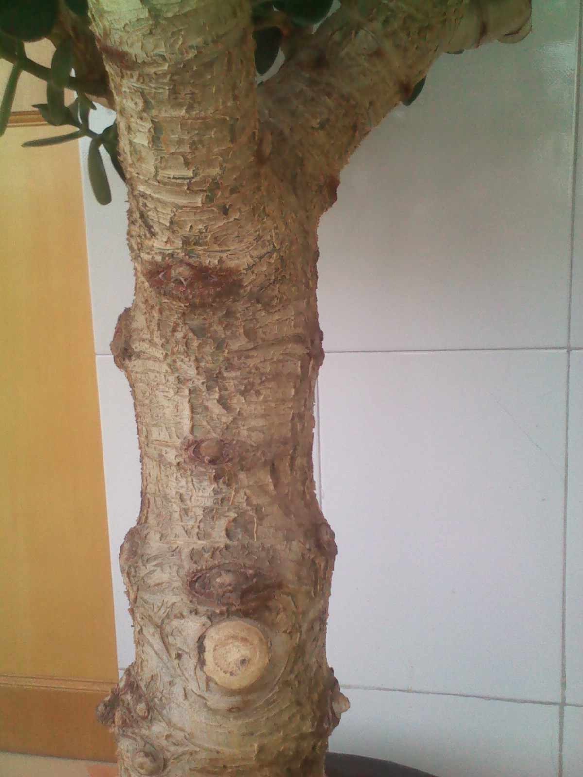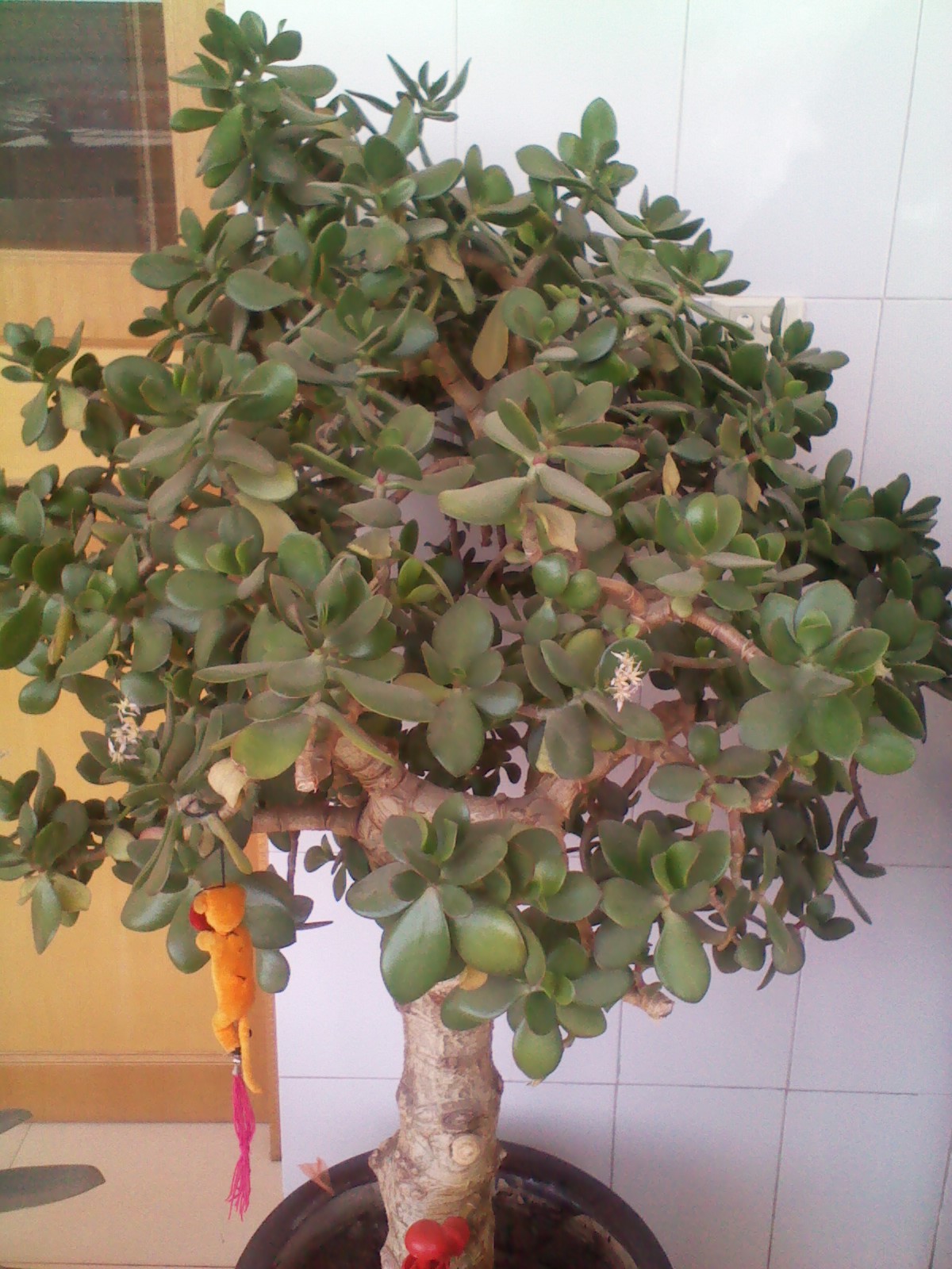 那次奶奶从金钱树的枝上摘下一个小枝,经过我们的不断浇水、施肥、松土、除草。它最终没有辜负我们对它的期望,终于长成了一棵"参天大树"它的茎很粗,因为可以储存储存水分,在不浇水的情况下,它可以保存实力,它的皮很粗糙,像一位饱经风霜、历经沧桑的老人,那般的闲苦。