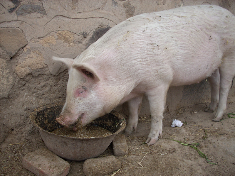 这只猪吃东西的时候,两个耳朵像大扇一样一扇一扇的,脑袋一颠一颠的,眼睛紧紧地盯着食物.