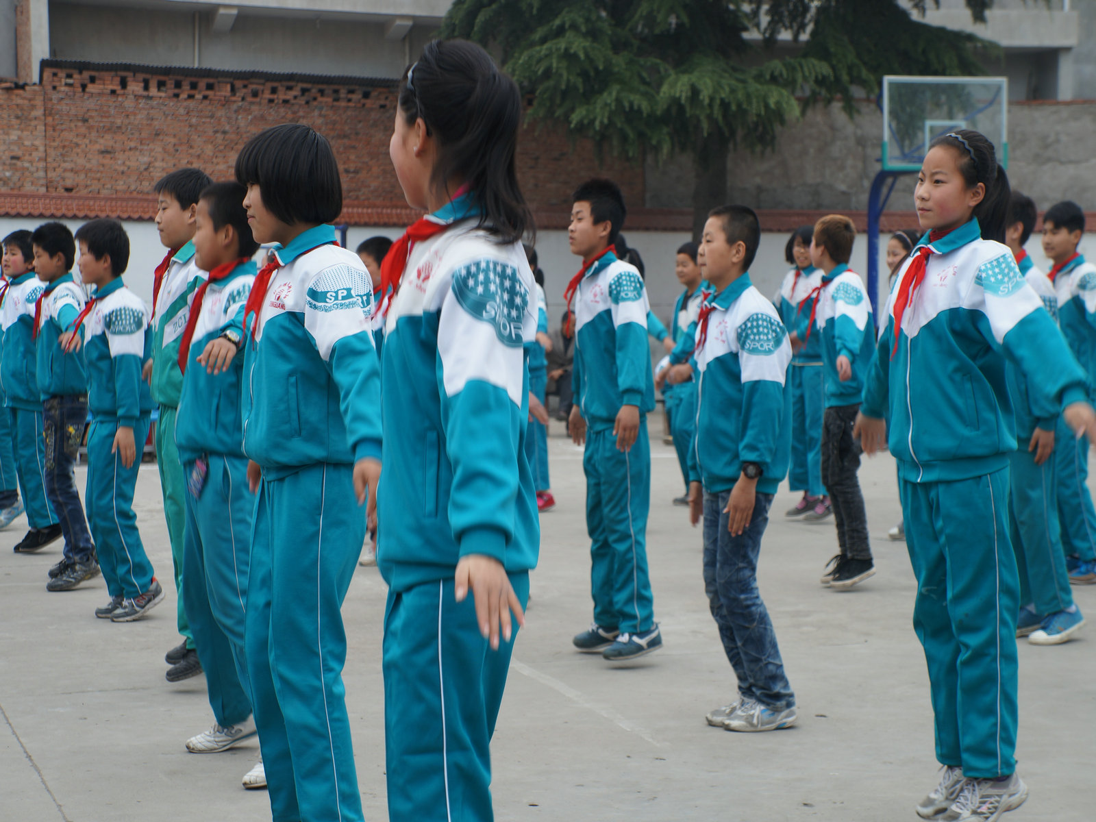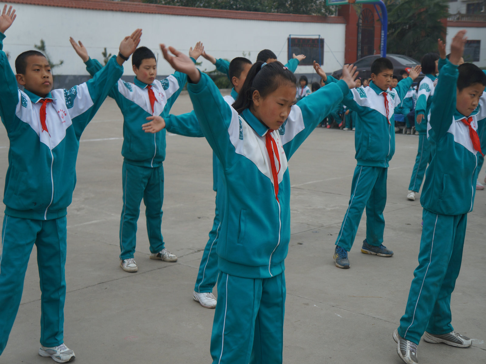 各班文体委员个个声音响亮,指挥自如。各班参赛的队员们身着统一的运动服,戴着鲜艳的红领巾,个个精神饱满,随着优美的旋律伸展肢体,动作规范,节奏明快、整齐划一。