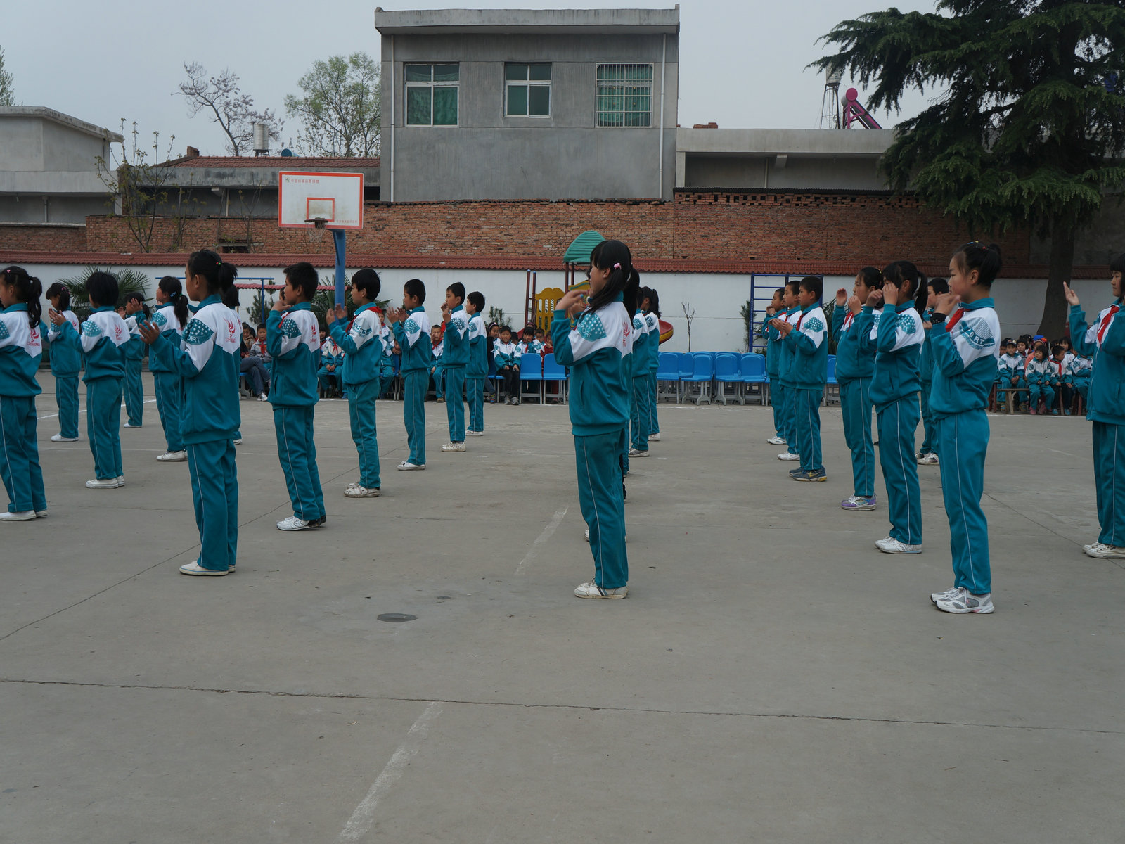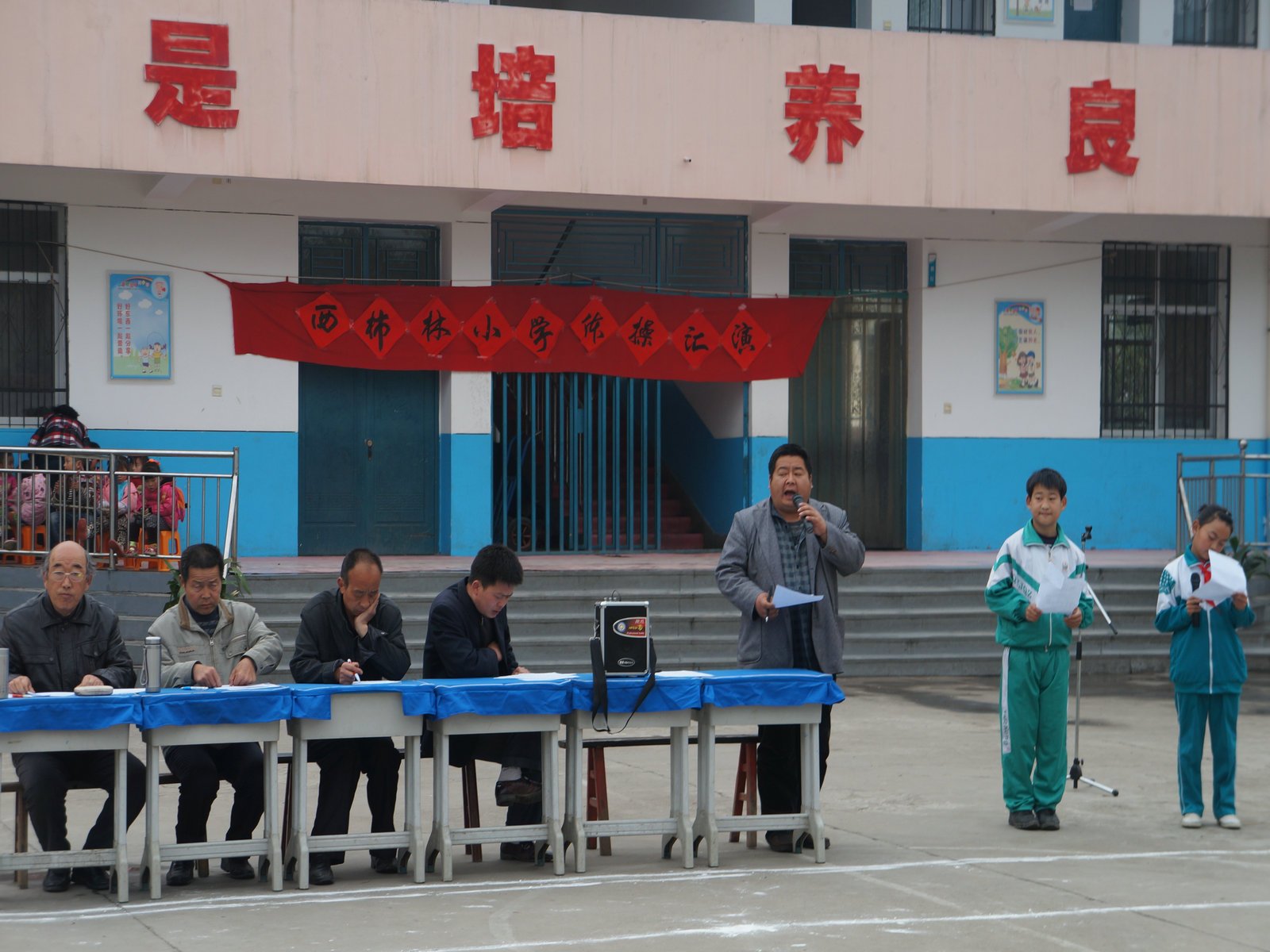 4月2日上午小雨淅淅沥沥,下午槐芽镇西柿林小学如期举行了队形队列体操汇演。本次比赛以班级为单位按抽签号依次进行,共有七位评委,主要从学生精神面貌、队形队列、口号指挥、广播体操等全面进行评比。