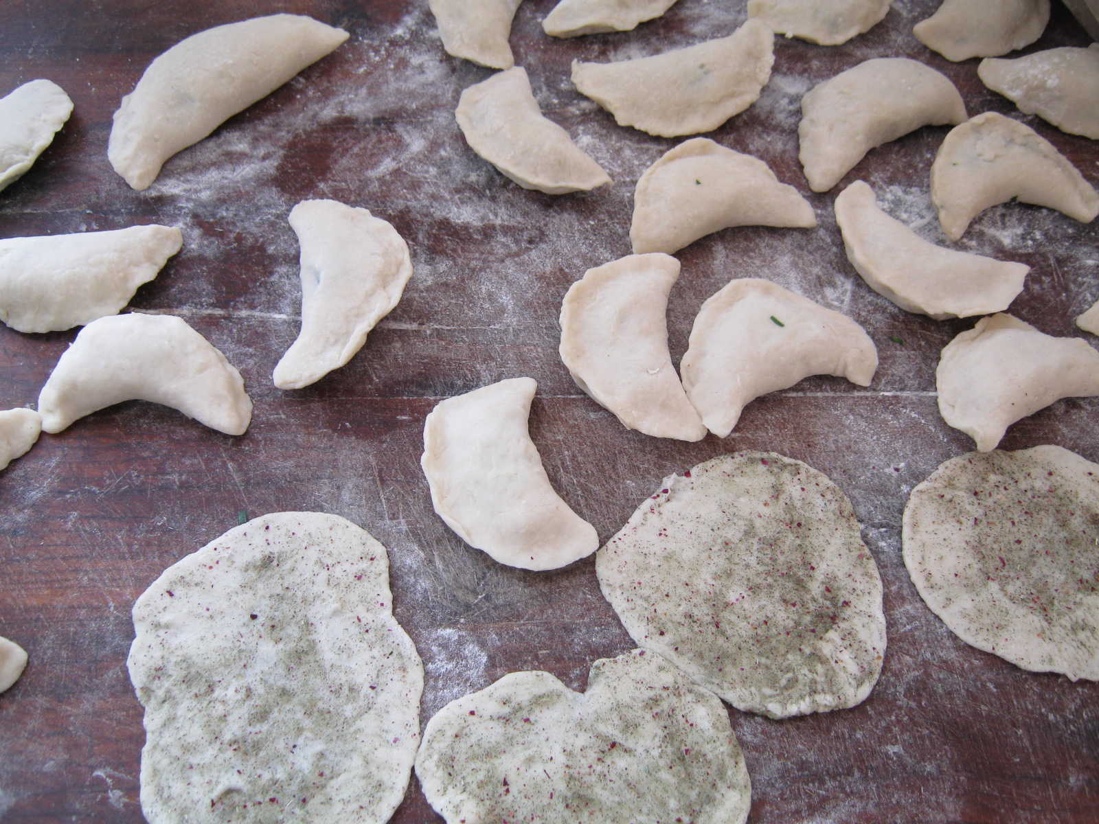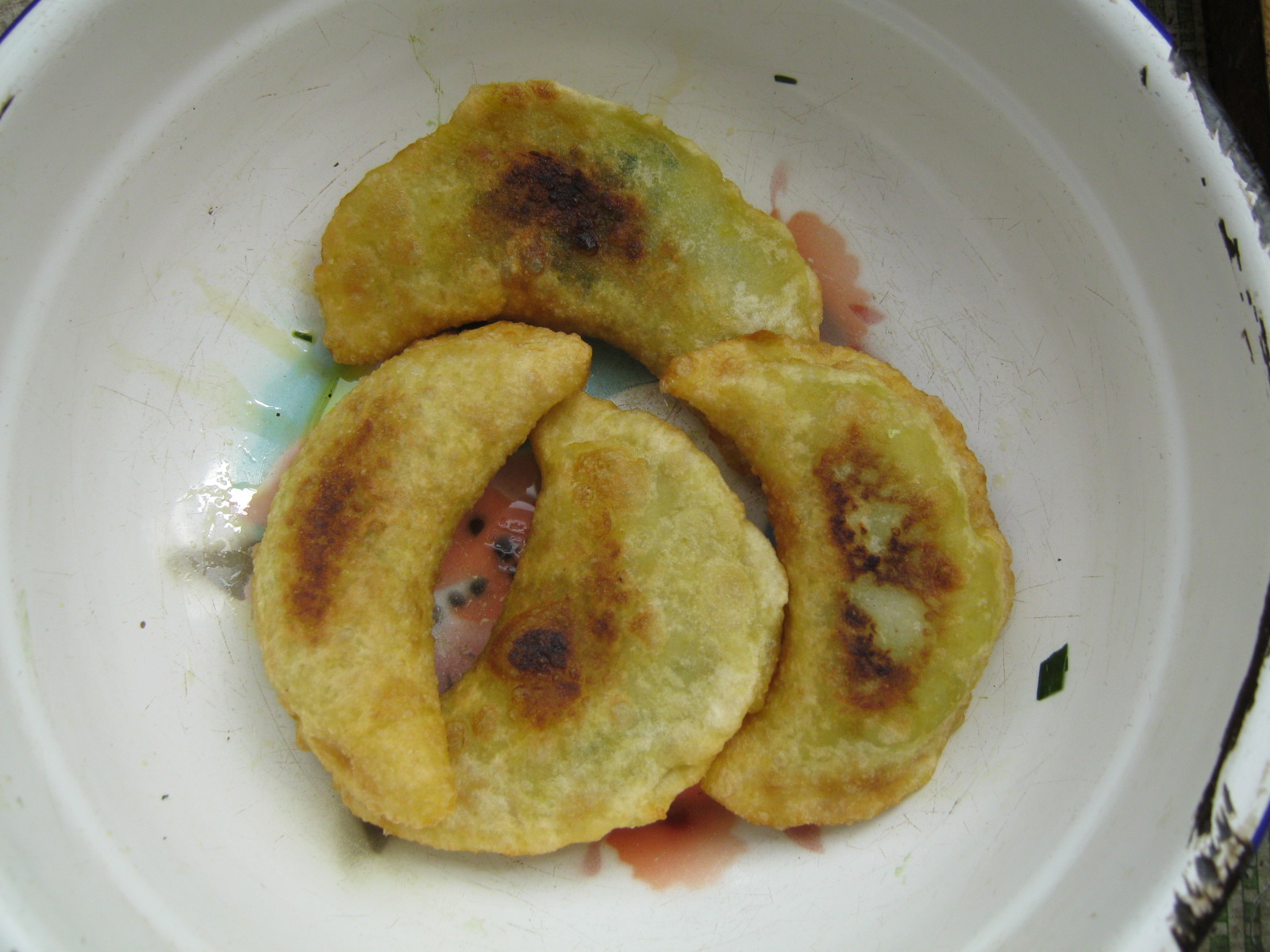 一盆青翠欲滴的韭菜馅里,藏着不少好东西:有剁碎的韭菜,有搅碎的嫩滑鸡蛋,韭菜上还沾着香油汁儿。用勺子搅上一搅,就能闻到一股子鲜味儿。我也学着妈妈的样子,把一块面团擀成圆形,又扁又圆的面皮做好后,再舀上一勺调好的馅儿,将面皮边压实,一个半月形的韭菜鸡蛋盒子就做好了。