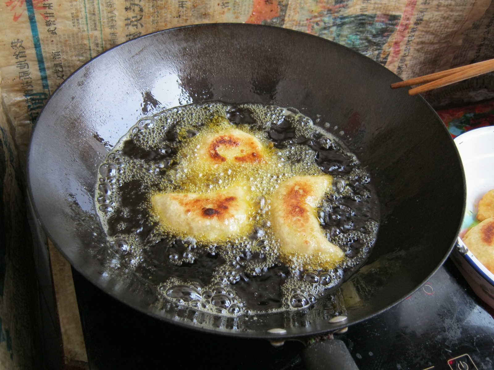 接下来的工作便是把锅烧热,加入少许油,用中火。因为火大了韭菜鸡蛋盒子会焦,火小了韭菜鸡蛋盒子没有黄亮的金色。等到油滚了,再放入韭菜馅饼。等到底部金黄时翻面继续煎,反复几次。煎到自己满意的程度即可出锅。